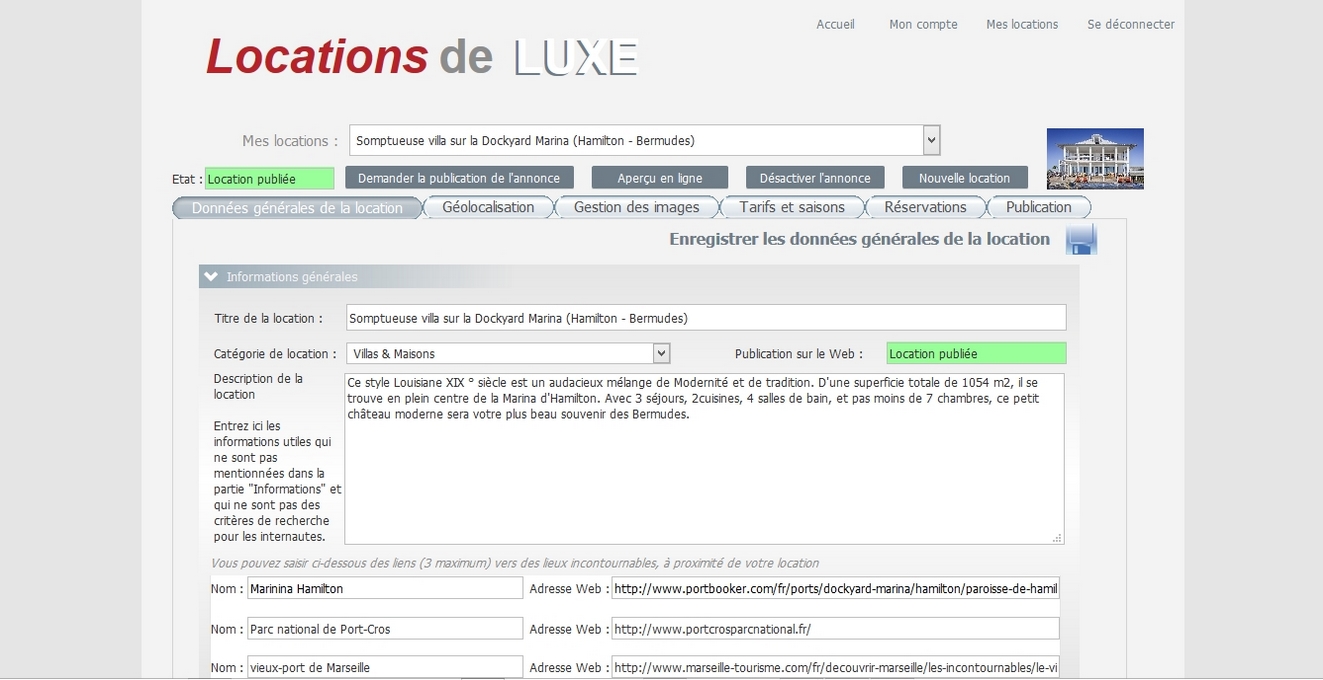 | | | | LOCATIONS DE LUXEsite web d'annonces de locations luxueuses de particulier à particulier. Ce site permet la gestion des locations, des tarifs, des contacts, des plannings, des réservations, des photos, paiements en ligne, etc.