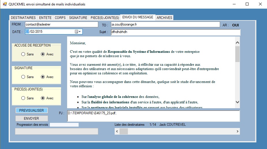 - possibilité de construire un mail entièrement personnalisé en y inculant l'entête et le corps au format html, une signature , un AR, des PJ, etc...