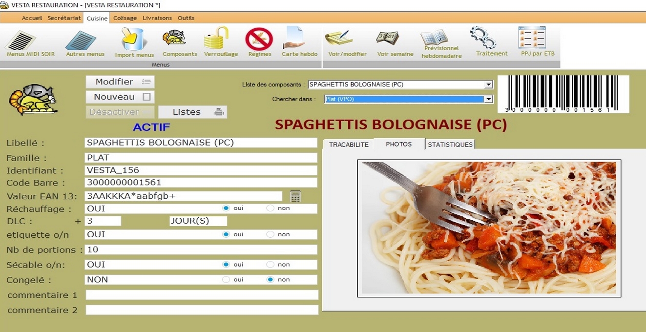 | | | | | VESTA RESTAURATIONLogiciel complet de restauration pour la gestion :- des ingrédients, menus et cartes et leur envoi sur un site web spécialement conçu. - des clients, leurs accès au site web, la récupération de leurs commandes de repas, la production, l'édition des documents, etc.- du colisage (contrôle par lecture codes barres).- de la livraison (secteurs, tournées, optimisation, GPS, etc)- de la facturation, etc.Ce logiciel est développé avec WinDev.